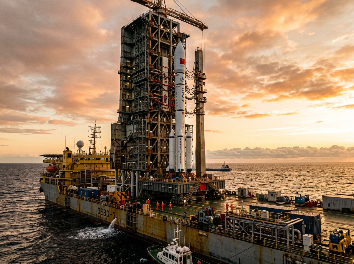 The Long March 11H launchpad aboard the DeBo-3 special converted barge is China's sea launch platform for the Long March 11H (11 Hypergolic) rocket, enabling launches from the Yellow Sea equatorial approach corridors that reduce propellant consumption for sun-synchronous and inclined orbits. First used on 15 September 2020, the barge-based system allows propellant loading to occur offshore away from populated areas and provides flexible launch positioning unavailable from China's fixed inland launch sites. Sea launches also allow the spent first stages to fall safely into the ocean rather than over populated inland territories, a persistent safety concern with China's inland launch facilities. The program has successfully supported multiple commercial satellite constellation missions.