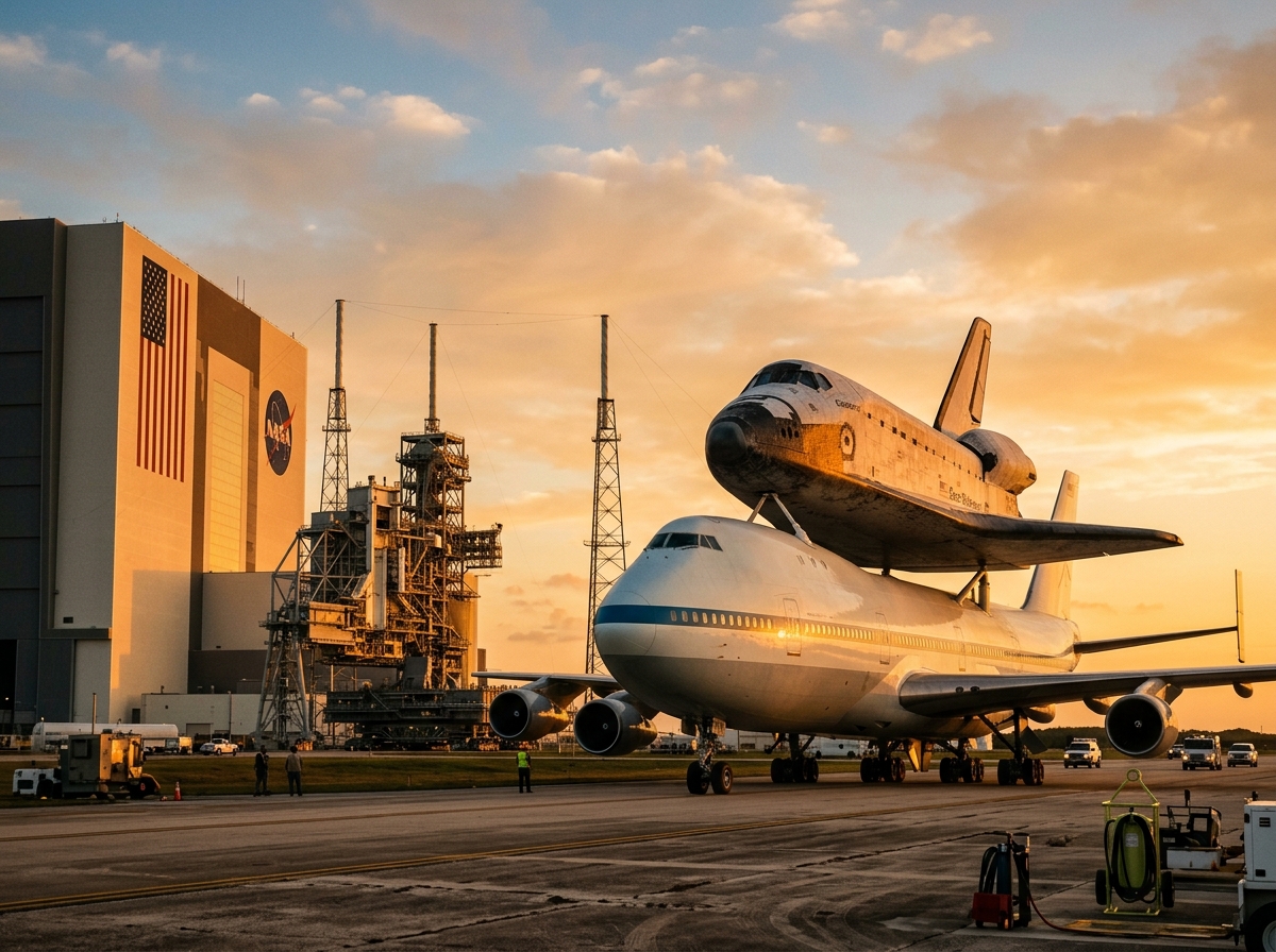 NASA's Shuttle Carrier Aircraft (SCA) were two modified Boeing 747-100 airliners (N905NA and N911NA) used to ferry Space Shuttle orbiters between Edwards Air Force Base, Kennedy Space Center, and other locations when the orbiters could not land at KSC. The distinctive configuration — with the orbiter mounted atop the 747's fuselage via three attach points and two vertical tail fins added for directional stability — first flew on 18 February 1977 with Enterprise for the Approach and Landing Tests. The SCAs transported orbiters after landings at Edwards and White Sands, and delivered the Enterprise to the 1984 World's Fair and subsequently to the Smithsonian. Both aircraft were retired with the Shuttle program in 2012, with N905NA now displayed at Space Center Houston and N911NA at the California Science Center.