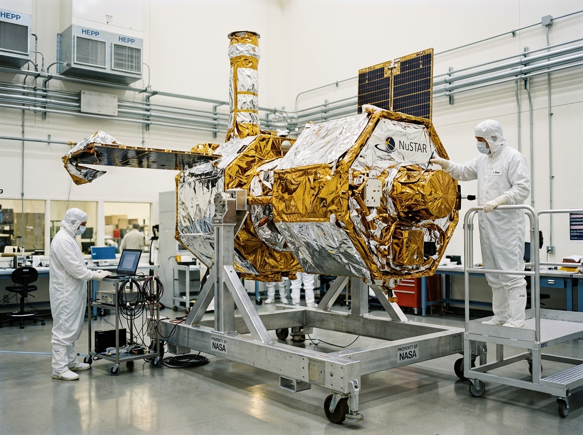 NuSTAR (Nuclear Spectroscopic Telescope Array, Explorer 93) is NASA's first focusing hard X-ray telescope in space, launched on 13 June 2012 aboard a Pegasus XL rocket air-launched from a Stargazer aircraft over the central Pacific. The telescope uses grazing-incidence optics on a 10-meter mast to focus X-rays between 3 and 79 keV — energies far higher than any previous focusing telescope — onto a pair of solid-state detectors at the focal plane. NuSTAR has studied the hard X-ray emission from black hole accretion disks, mapped radioactive titanium-44 in young supernova remnants tracing the explosive dynamics of stellar explosions, and discovered a population of previously unknown hard X-ray sources in the Galactic Center. The mission continues operating more than a decade past launch with no degradation in detector performance.