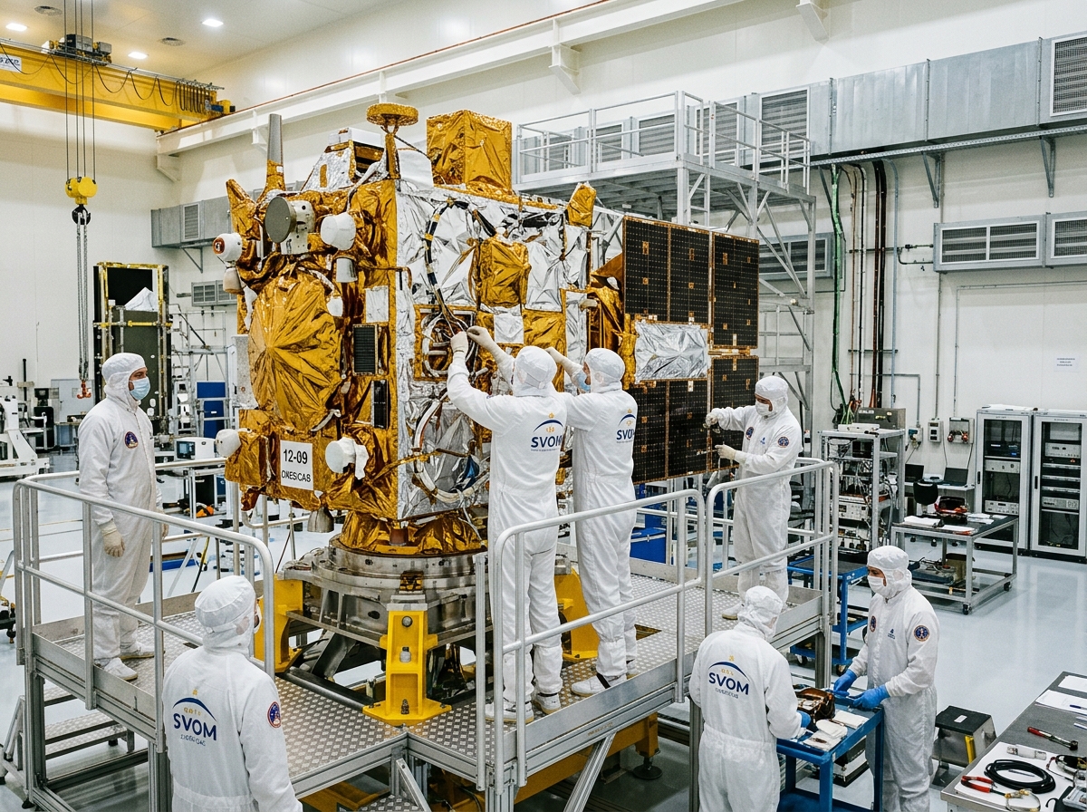 SVOM (Space Variable Objects Monitor) is a joint Chinese-French X-ray and gamma-ray astronomy satellite launched in June 2024, designed to detect and rapidly localize gamma-ray bursts and other high-energy transient events to enable rapid follow-up observations from ground and space-based telescopes. The mission builds on the heritage of the Swift and INTEGRAL satellites, combining a wide-field burst detector, an X-ray telescope, and an optical monitor to provide multi-wavelength characterization of transients in near real time. SVOM's unique orbit allows simultaneous visibility from Chinese and French ground stations for rapid alert dissemination to the global astronomy community. The mission represents a major step in the ongoing China-France space science collaboration.