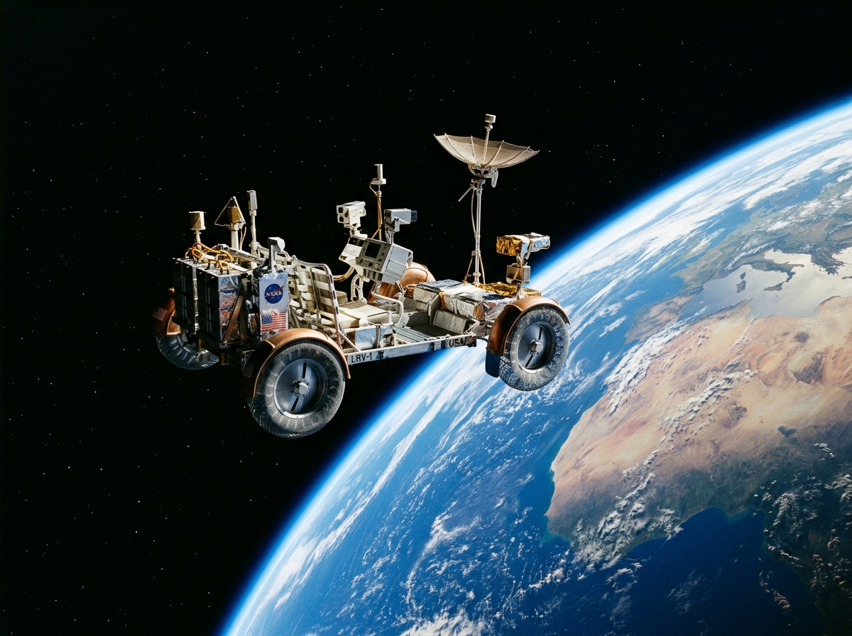 Lunar Roving Vehicle (LRV) is NASA's electric-powered four-wheeled rover used by Apollo astronauts on the Moon during missions Apollo 15, 16, and 17 between 1971 and 1972, enabling geological traverses far beyond walking range from the lander. Built by Boeing with a maximum speed of about 13 km/h, the collapsible LRV stowed in the lunar module descent stage quadrant and deployed on the surface, weighing only 210 kg but carrying up to 490 kg of crew, equipment, and samples. The three Apollo LRVs collectively drove 90 km of lunar surface and extended the scientifically productive range of each mission to tens of kilometers, enabling sample collection from diverse geological units. The Apollo 17 LRV holds the lunar land speed record of 18 km/h set by Gene Cernan.